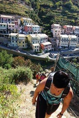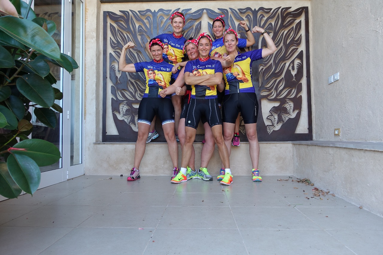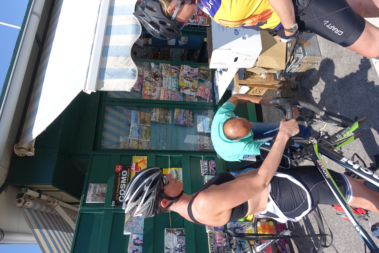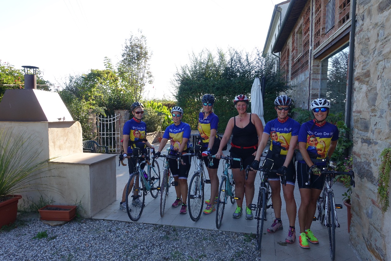 Halveis til Massa hørte vi plutselig Camilla rope "neeei" - punkteringen var et faktum, og vi trudde at nå var turen over for idag. Vi hadde med oss ny slange og verktøy i sykkelveskene våre, men ingen av oss kan skryte av å ha så mye erfaring med slangeskifte. Mens vi stod der å gestikulerte og reiv oss i håret, kom en liten italiensk smilende mann gående mot oss og ropte "I have a" - så mima han sykkelpumpa. Og alle Rosiene i kor - ÅÅÅÅÅÅÅ...... Camilla heiv sykkeln på skuldran og spaserte etter italieneren, og resten av damene fulgte på. Mario som han het prøvde å pumpe opp dekket, men konkluderte kjapt med at her var det bare å skifte slange. Han heiv sæ elegant rundt i skruinga, og vi var overlykkelige over å ha fått hjelp. Mens vi nu stod der og venta, kom det ei dama ut fra den lille bua hannes med et bilde. Det viste sæ at mannen som hjalp oss var en gammel proffsyklist fra -80 talllet. Hjelpa fra han var altså som sendt fra "oven". Vips så var vi på veien igjen.